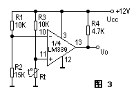 图3为某仪器中过热检测保护电路。它用单电源供电,1/4LM339的反相输入端加一个固定的参考电压,它的值取决于R1于R2。UR=R2/(R1+R2)*UCC。同相端的电压就等于热敏元件Rt的电压降。当机内温度为设定值以下时,“+”端电压大于“-”端电压,Uo为高电位。当温度上升为设定值以上时,“-”端电压大于“+”端,比较器反转,Uo输出为零电位,使保护电路动作,调节R1的值可以改变门限电压,既设定温度值的大小。