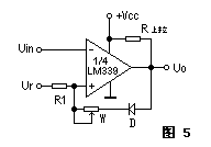 如果需要将一个跳变点固定在某一个参考电压值上,可在正反馈电路中接入一个非线性元件,如晶体二极管,利用二极管的单向导电性,便可实现上述要求。图5为其原理图。