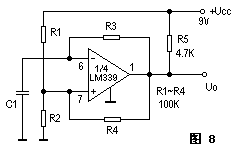 图8为有1/4LM339组成的音频方波振荡器的电路。改变C1可改变输出方波的频率。本电路中,当C1=0.1uF时。f=53Hz;当C1=0.01uF时,f=530Hz;当C1=0.001uF时,f=5300Hz。