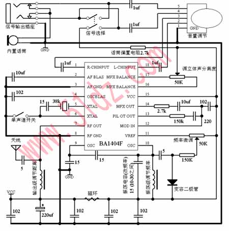 二、电路原理图及工作原理: BA1404的引脚功能如图表1所示,图1为BA1404结构功能框图。它主要由前置音频放大器(AMP),立体声调制器(MPX),FM调制器及射频放大器组成。