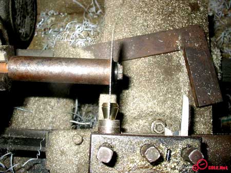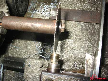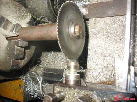 对于可以车削的部分都没问题,现在难点来了:怎么开切口?,试过用钢锯开,开的口太大不说,还很难锯的直,这就想到了一个办法,利用车床上锯片铣刀开。