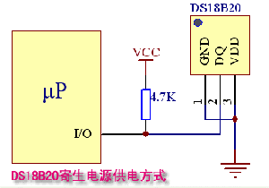 改进的寄生电源供电方式如下面图5所示,为了使DS18B20在动态转换周期中获得足够的电流供应,当进行温度转换或拷贝到 E2存储器操作时,用MOSFET把I/O线直接拉到VCC就可提供足够的电流,在发出任何涉及到拷贝到E2存储器或启动温度转换的指令后,必须在最 多10μS内把I/O线转换到强上拉状态。在强上拉方式下可以解决电流供应不走的问题,因此也适合于多点测温应用,缺 点就是要多占用一根I/O口线进行强上拉切换。