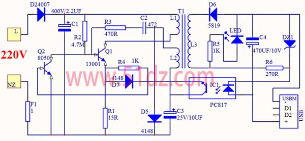 该电路由开关电源和输出电路两部分组成。当接通电源后,220V交流通过D2整流,C1滤波,通过电阻R2给三极管Q1提供基极启动电流,使Q1开始导通,其集电极电流Ic线性增长,在L2中感应出使Q1基极为正、发射极为负的正反馈电压,通过C2和R3,送到Q1基极,使Q1迅速饱和。与此同时,感应电动势给电容C2充电,随着C2充电电压升高,Q1基极电位逐渐下降,Ic开始减小,在L2中感应出使Q1基极为负,发射极为正的电压,使Q1迅速截止,完成一个振荡周期,在Q1截止期间,在L3绕组感应出一个5V左右的交流电压。此后,C2逐渐放电,Q1基极电压逐渐升高,从而开始第二个周期,不断循环。L3输出电压经D6整流、C4滤波后通过USB座给负载供电。LED1和R5组成输出指示电路。DZ1、IC1、Q2等组成取样比较电路,检查输出电压的高低。当负载变轻或电源电压升高等原因导致输出电压升高时,Z1击穿,IC1中发光二级管电流增大,IC1中光敏三极管电流增大。L2反馈绕组中的感应电压经IC1中的光敏三极管到Q2基极,Q2基极电流增大,集电极电流增大,Q1基极电流减小,集电极电流减小,负载能力变小,从而导致输出电压降低。当输出电压降低后,Q2取样后又会截止,Q1的负载能力变强,输出电压升高,这样起到自动稳压作用。D5为L2绕组输出电压整流二极管,C3为滤波电容。